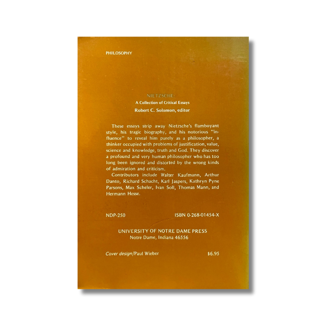 These essays strip away Nietzsche´s flamboyant style, his tragic biography, and his notorius "influence" to reveal him purely as a philopher, a thinker occupied with problems of justification, value, science and knowledge, truth and God. they discover a profound and very human philosopher whi has too long been ignored and distorted by the wrong kinds of admiration and criticism. Contributors include Walter Kaufmann, Arthur Danto, Richard Schacht, Karl Jaspers, Kathryn Pyne Parsons, Max Scheler, Ivan Soll, thomas Mann, and Hermann Hesse.