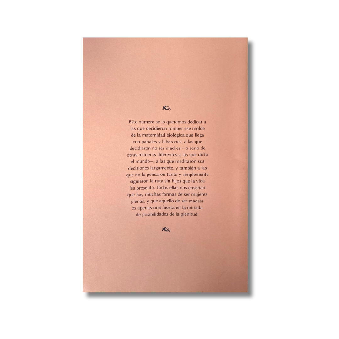 Este número se lo queremos dedicar a las que decidieron romper ese molde de la maternidad biológica que llega con pañales y biberones, a las que decidieron no ser madres -o serlo de otras maneras diferentes a las que dicta el mundo-, a las que meditaron sus decisiones largamente, y también a las que no lo pensaron tanto y simplemente siguieron la ruta sin hijos que la vida les presentó. Todas ellas nos enseñan que hay muchas formas de ser mujeres plenas, y que aquello de ser madres es apenas una faceta en la miríada de posibilidades de plenitud.