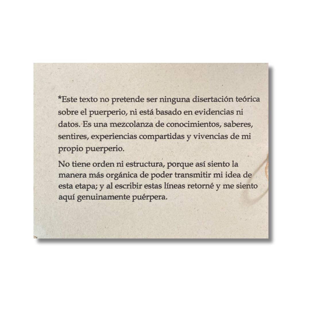Este texto no pretende ser ninguna disertación teórica sobre el puerperio, ni está basado en evidencias ni datos. Es una mezcolanza de conocimientos, saberes, sentires y experiencias compartidas y vivencias de mi propio puerperio.