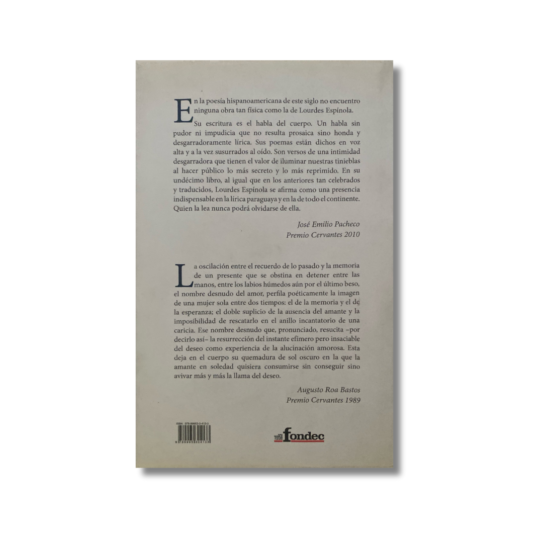 Su escritura es el habla del cuerpo. Un habla sin pudor ni impudicia que no resulta prosaica sino honda y desgarradoramente lírica. Sus poemas están dichos en voz alta y a la vez susurrados al oído. Son versos de una intimidad desgarradora que tienen el valor de iluminar nuestras tinieblas al hacer público lo más secreto y lo más reprimido. En su undécimo libro. al igual que en los anteriores tan celebrados y traducidos, Lourdes Espínola se afirma como una presencia indispensable en la lírica paraguaya y en la de todo el continente.