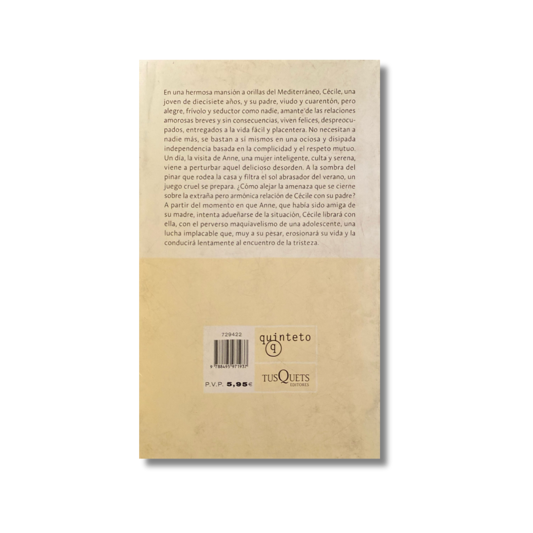 En una hermosa mansión a orillas del Mediterráneo, Cécile, una joven de diecisiete años, y su padre, viudo y cuarentón, pero alegre, frívolo y seductor como nadie, amante de las relaciones amorosas breves y sin consecuencias, viven felices, despreocupados, entregados a la vida fácil y placentera. No necesitan a nadie más, se bastan a si mismos en una ociosa y disipada independencia basada en la complicidad y el respeto mutuo. Un día, la visita de Anne, una mujer inteligente, culta y serena, viene a perturbar aquel delicioso desorden. A la sombra del pinar que rodea la casa y filtra el sol abrasador del verano, un juego cruel se prepara. ¿Cómo alejar la amenaza que se cierne sobre la extraña pero armónica relación de Cécile con su padre ? A partir del momento en que Anne, que había sido amiga de su madre, intenta adueñarse de la situación, Cécile librará con ella, con el perverso maquiavelismo de una adolescente, una lucha implacable que, a pesar suyo, erosionará su vida y la conducirá lentamente al encuentro de la tristeza.