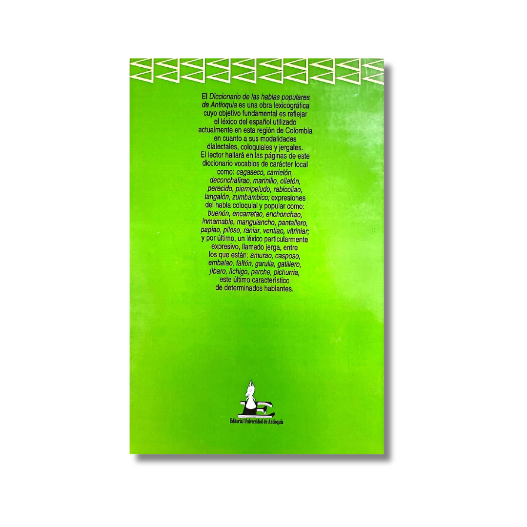 El Diccionario de las hablas populares de Antioquia es una obra lexicográfica cuyo objetivo fundamental es reflejar el léxico del español utilizado actualmente en esta región de Colombia en cuanto a sus modalidades dialectales, coloquiales y jergales. El lector hallará en las páginas de este diccionario vocablos de carácter local como: cagaseco, carrielón, deconchafirao, marinillo... expresiones del habla local como: buenón, encarretao, inmamable... y por último, un léxico particularmente expresivo, llamado jerga: amurao, casposo, embalao.