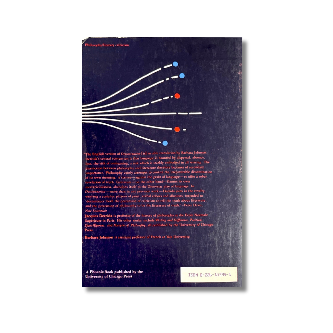 The English version of Dissemination [is] an able translation by Barbara Johnson. Derrida´s central contention is that language is haunted by dispersal, absence, loss, the risk of unmeaning, a risk which is starkly embodied in all writing. The distinction between philosophy and literature therefore becomes of secondary importance. In Disseminations —more than in any previous work— Derrida joins in the revelry, eaving a complex pattern of puns, verbal echoes and allusions, intended to ´deconstruct´ both the pretension of criticism to tell the truth about literature, and the pretension of philosophy to be the literature of truth.