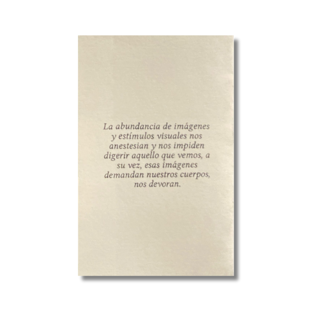 «La abundancia de imágenes y estímulos visuales nos anestesian y nos impiden digerir aquello que vemos, a su vez, esas imágenes demandan nuestros cuerpos, nos devoran.»