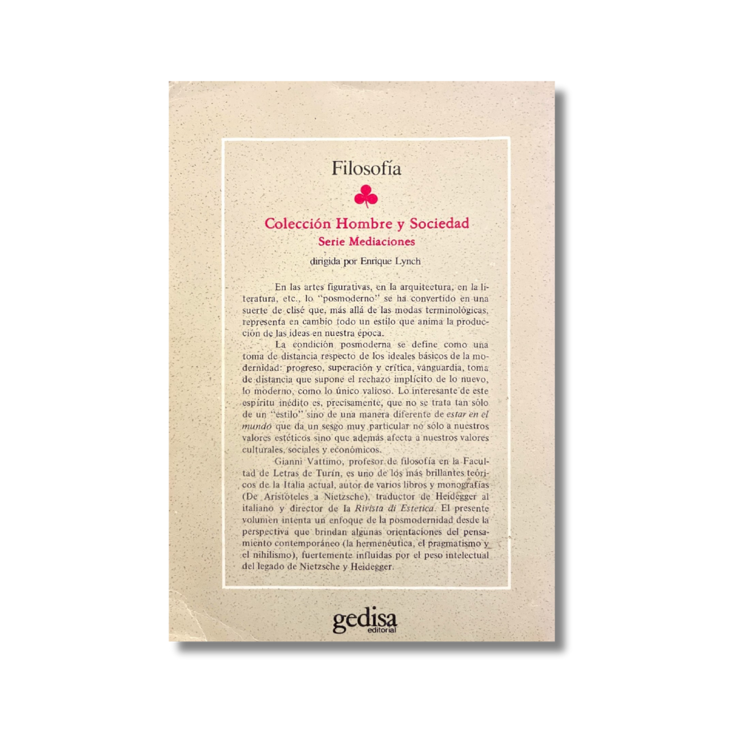 La condición posmoderna se define como una toma de distancia respecto de los ideales básicos de la modernidad: progreso, superación y crítica, vanguardia, toma de distancia que supone el rechazo implícito de los nuevo, lo moderno, como lo único valioso. Lo interesnate de este espíritu inédito es, precisamente, que no se trata tan sólo de un "estilo" sino de una manera diferente de estar en el mundo que da un sesgo muy particular no sólo anuestros valores estéticos sino que además afecta a nuestros valores culturales, sociales y económicos.