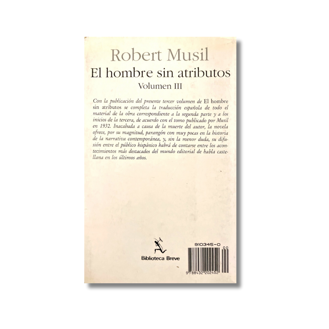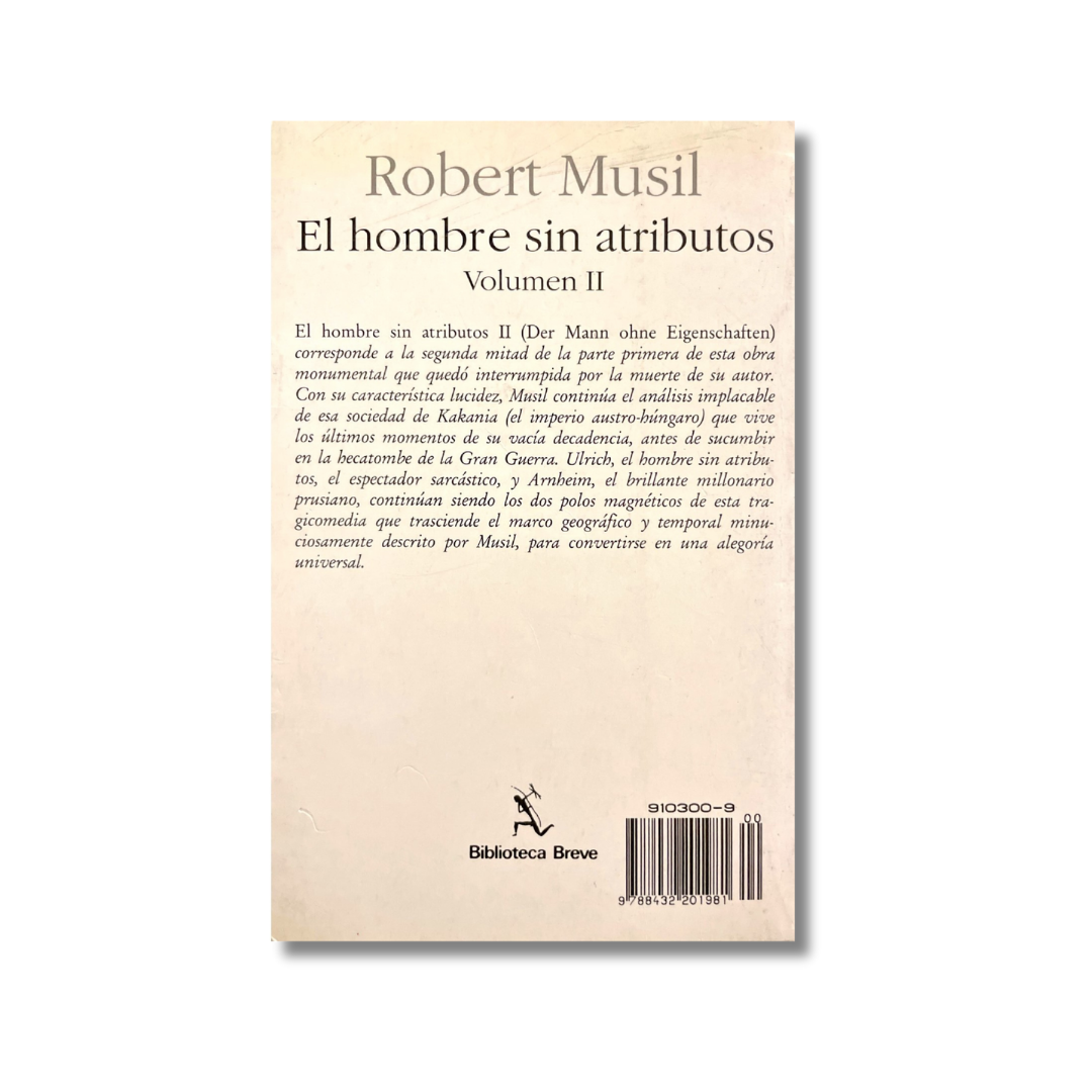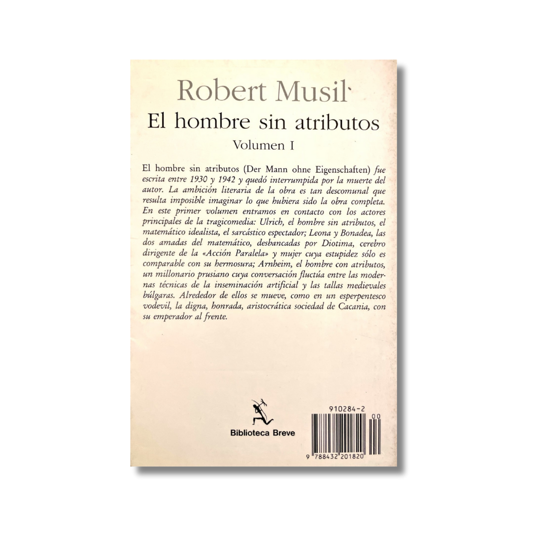 El hombre sin atributos fue escrita entre 1930 y 1942 y quedó interrumpida por la muerte del autor. Los actores principales de esta tragicomedia monumental son: Ulrich, el hombre sin atributos, el matemático idealista, el sarcástico espectador; Leona y Bonadea, las dos amadas del matemático, desbancadas por Diotima, cerebro dirigente de la «Acción Paralela» y mujer cuya estupidez sólo es comparable a su hermosura; y Arnheim, el hombre con atributos, un millonario prusiano cuya conversación fluctúa entre las modernas técnicas de la inseminación artificial y las tallas medievales búlgaras.