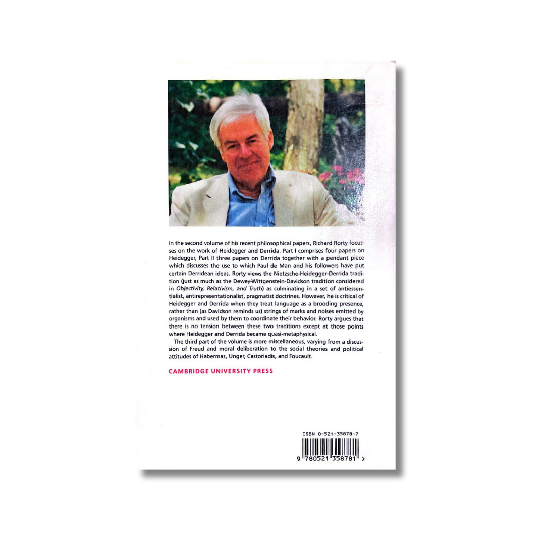 The second volume pursues the themes of the first volume in the context of discussions of recent European philosophy focusing on the work of Heidegger and Derrida. His four essays on Heidegger include "Philosophy as Science, as Metaphor and as Politics" and "Heidegger, Kundera, and Dickens;" three essays on Derrida (including "Deconstruction and Circumvention" and "Is Derrida a Transcendental Philosopher?") are followed by a discussion of the uses to which Paul de Man and his followers have put certain Derridean ideas. Rorty's concluding essays broaden outward with an essay on "Freud and Moral Deliberation" and essays discussing the social theories and political attitudes of various contemporary figures--Foucault, Lyotard, Habermas, Unger, and Castoriadis.