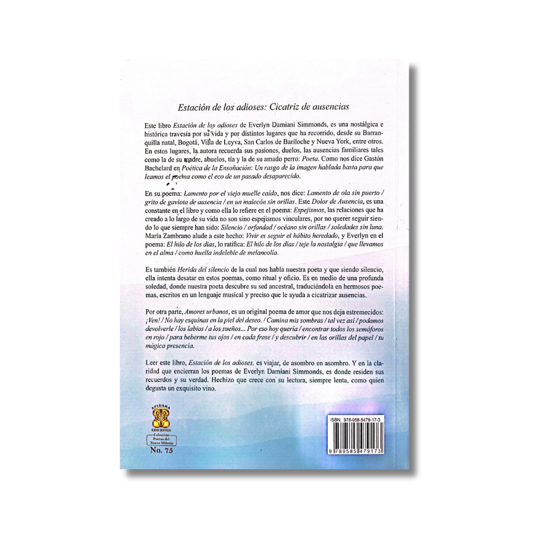 Este libro Estación de los adioses de Evelyn Damiani Simmonds, es una nostálgica e histórica travesía por su vida y por distintos lugares que ha recorrido, desde su Barranquilla natal, Bogotá, Villa de Leyva, San Carlos de Bariloche y Nueva York, entre otros. En estos lugares, la autora recuerda sus pasiones, duelos, las ausencias familiares tales como la de su padre, abuelos, tía y la de su amado perro: Poeta. Como nos dice Gastón Bachelard en Poética de la Ensoñación: Un rasgo de la imagen hablada basta para que leamos el poema como el eco de un pasado desaparecido.