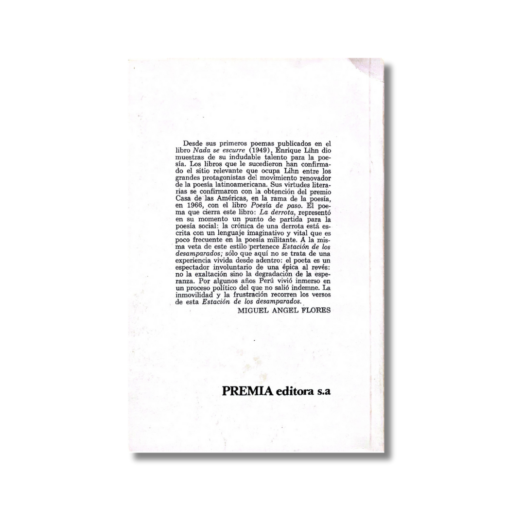 Desde sus primero poemas publicados en el libro Nada se escurre (1949), Enrique Lihn dio muestras de su indudable talento para la poesía. Los libros que le sucedieron han confirmado el sitio relevante que ocupaLihn entre los grandes protagonistas del movimiento renovador de la poesía latinoamericana. El poema que cierra este libro: La derrota, representó en su momento un punto de partida para la poesía social: la crónica de una derrota está escrita con un lenguaje imaginativo y vital que es poco frecuente en la poesía militante. A la misma veta de este estilo pertenece Estación de los desamparados; sólo que aquí no se trata de una experiencia vivida desde adentro: el poeta es un espectador involuntario de una épica al revés: no la exaltación sino la degradación de la esperanza. Por algunos años Perú vivió inmerso en un proceso político del que no salió indemne. La inmovilidad y la frustración recorren los versos de Estación de los desamparados.