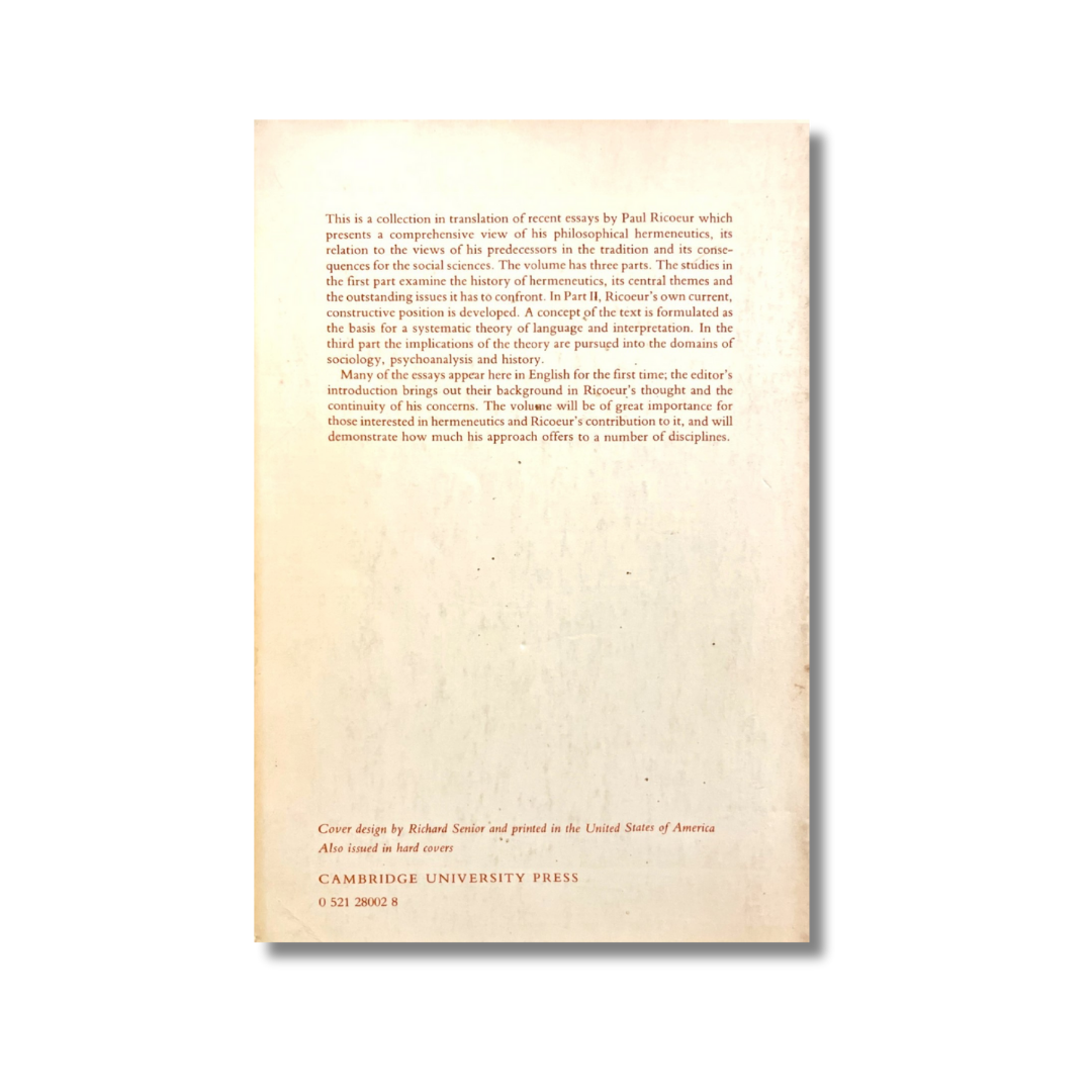 This is a collection in tralation of recent essays by Paul Ricoeur which presents a comprehensive view of his philosophical hermeneutics, its relation to the views of his predecessors in the tradition and its consequences for the social sciences. The volume has three parts. The studies in the first part examine the history of hermeneutics, its central themes and the outstanding issues it has to confront. In Part II, Ricoeur´s own current, constructive position is developed. A concept of the text is formulated as the basis for a systematic theory of language and interpretation. In the third part the implications of the theory are pursued into the domains of sociology, psychoanalysis and history.