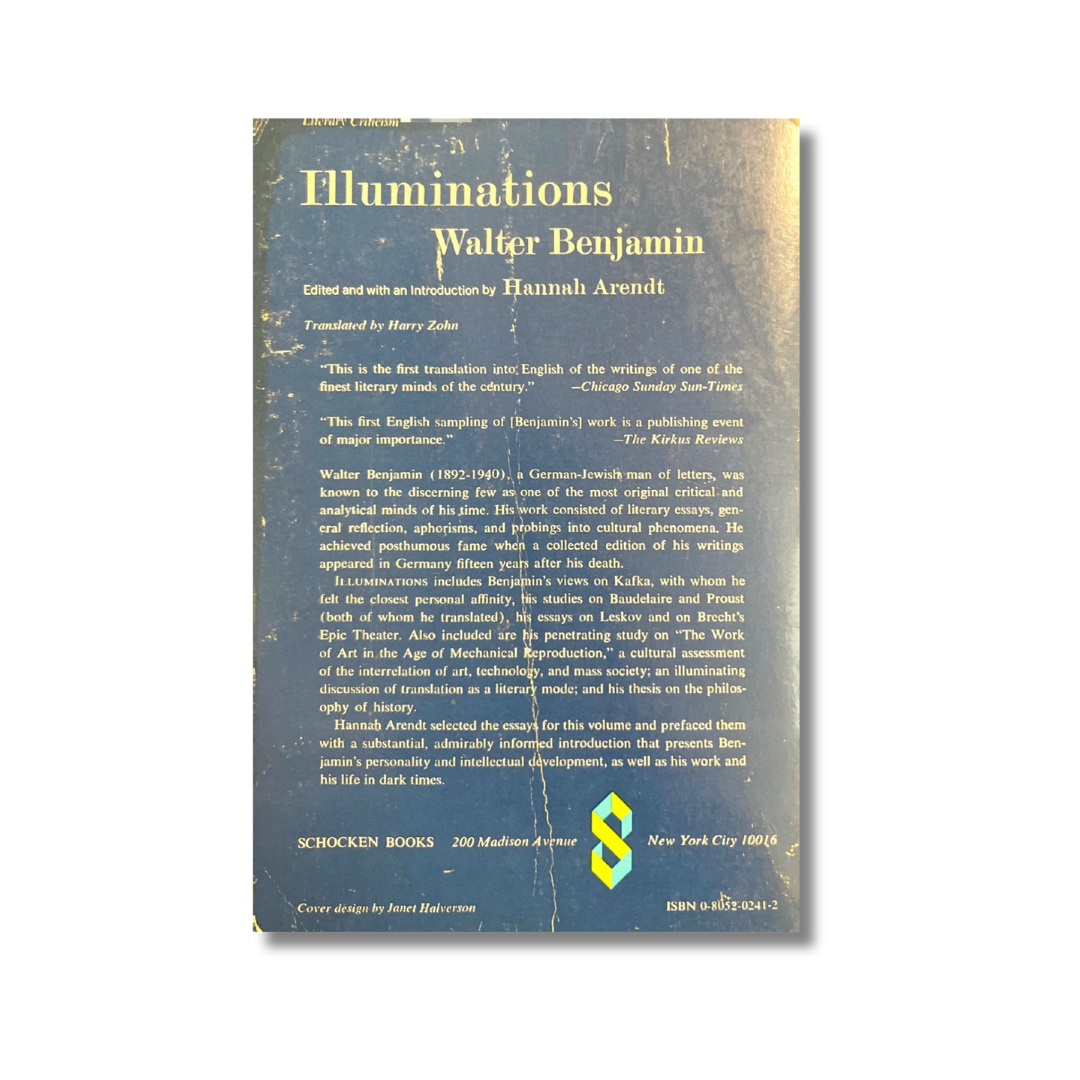 Illuminations includes Benjamin´s views on Kafka, with whom he felt the closest personal affinity, his studies on Baudelaire and proust (both of whom he translated), his essays on Leskov and on Brecht´s Epic theater. Also included are his penetrating study on "The work of Art in the Age of mechanical Reproduction", a cultural assessment of the interrelation of art, technology, and mass society; an illuminating discussion of traslation as a literary mode; and his thesis on the philosophy of history.