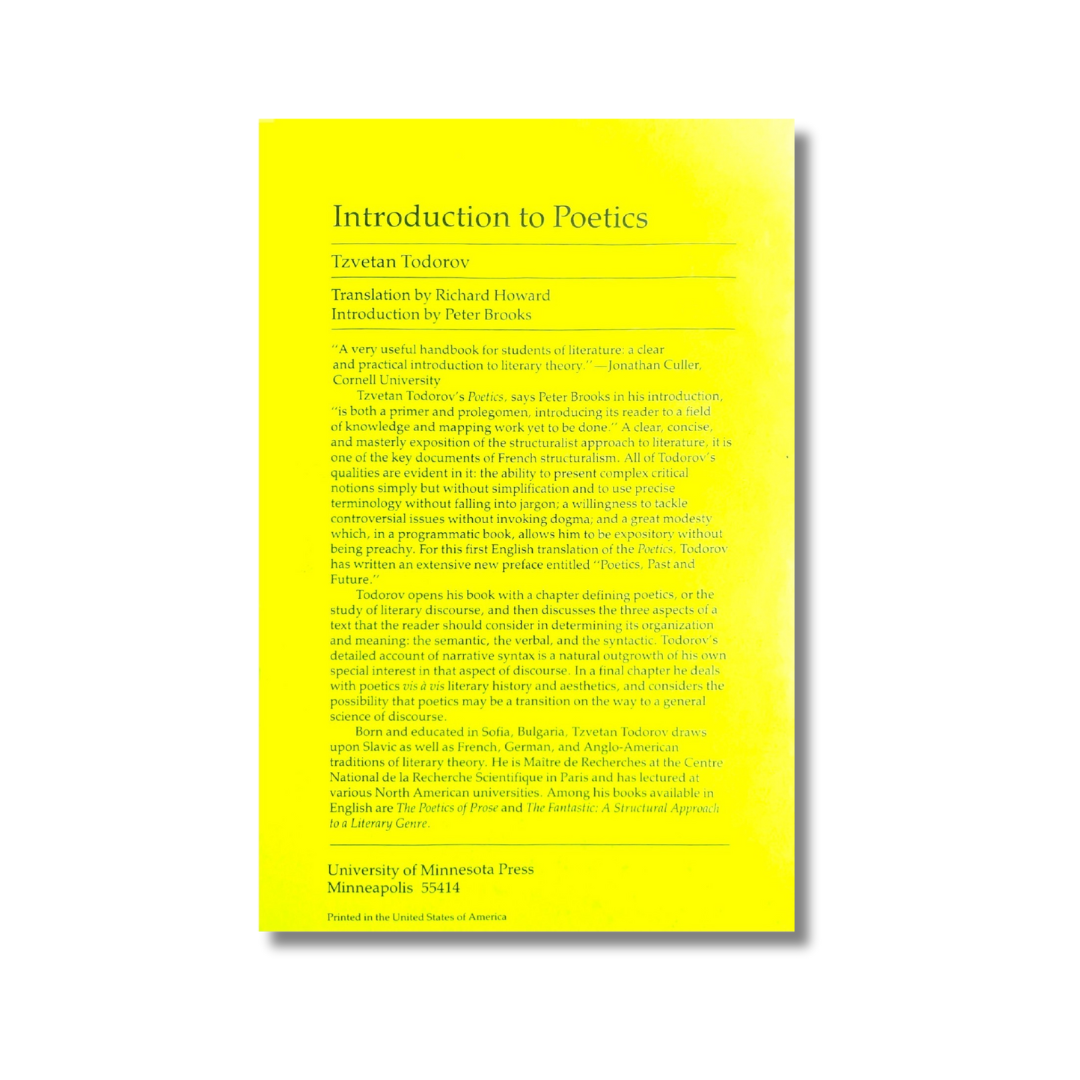 Tzvetan Todorov´s Poetics, says Peter Brooks in his introduction, "is both a primer and prolegomen, introducing its reader to a field of knowledge and mapping work yet to be done." A clear, concise, and masterly exposition of the structuralism. All of Todorov´s qualities are evident in it: the ability to present complex critical notions simply but without falling into jargon; a willingness to tackle controversial issues without invoking dogma; and a great modesty which, in a programmatic book, allows him to be expository without being preachy.