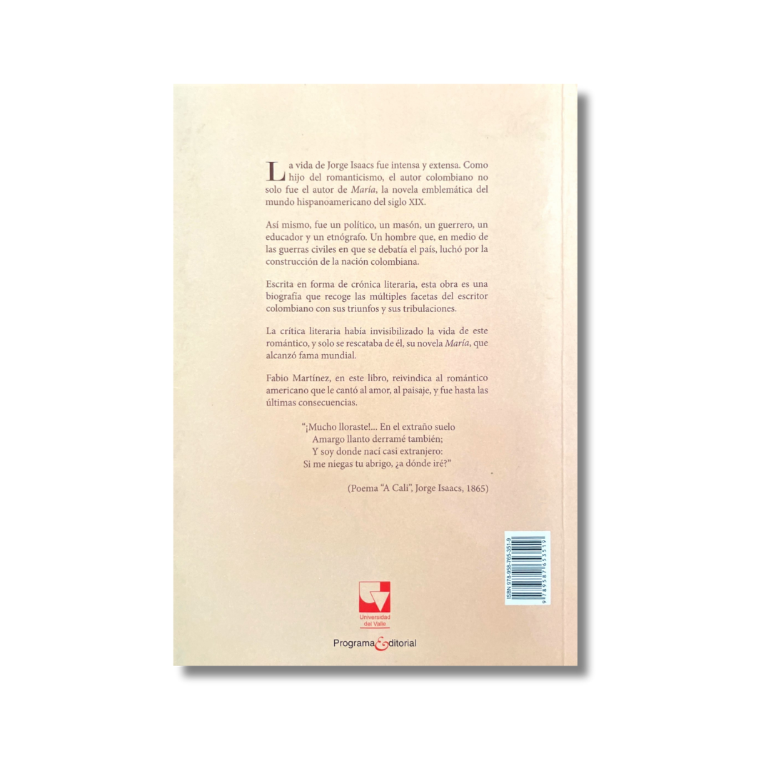 La vida de Jorge Isaacs fue extensa e intensa. Como hijo del romanticismo, el autor colombiano no solo fue el autor de María, la novela emblemática del mundo hispanoamericano del siglo XIX. Fue político, masón, guerrero, educador y etnógrafo.Un hombre que en medio de las guerras civiles en que se debatía el país, luchó por la construcción de la nación colombiana. Escrita en forma de crónica literaria, esta biografía recoge las multiples facetas del escritor con sus triunfos y tribulaciones.