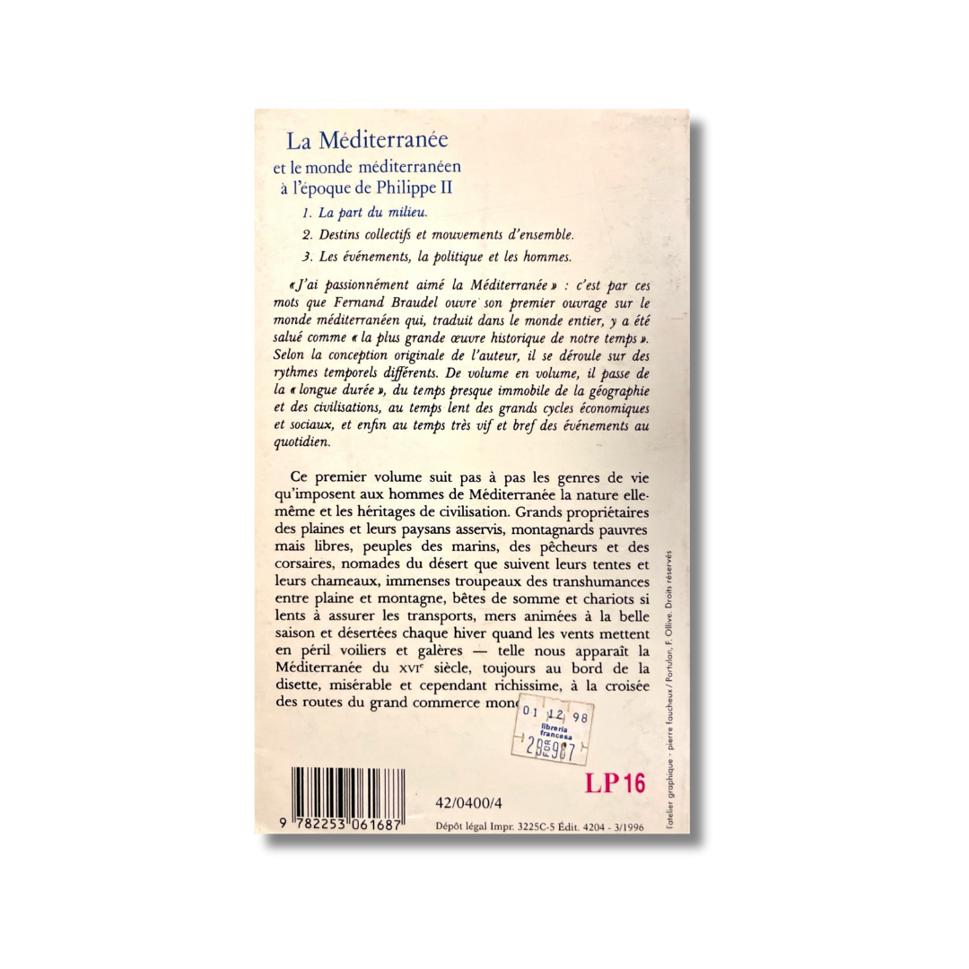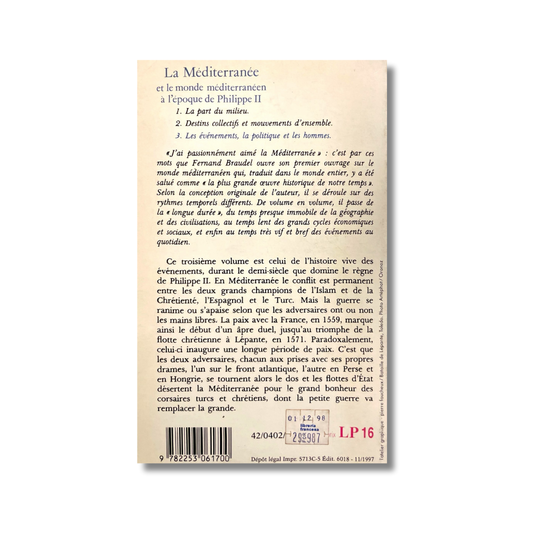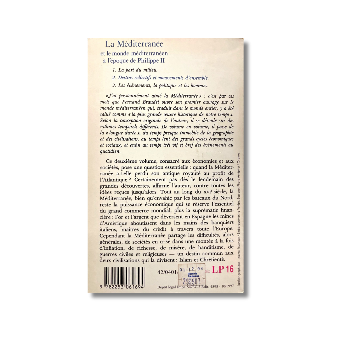 « J'ai passionnément aimé la Méditerranée. » : c'est par ces mots que Fernand Braudel ouvre son premier ouvrage sur le monde méditerranéen qui, traduit dans le monde entier, y a été salué comme « la plus grande oeuvre historique de notre temps ». Selon la conception originale de l'auteur, il se déroule sur des rythmes temporels différents. De volume en volume, il passe de la « longue durée », du temps presque immobile de la géographie et des civilisations, au temps lent des grands cycles économiques et sociaux, et enfin au temps très vif et bref des événements au quotidien.