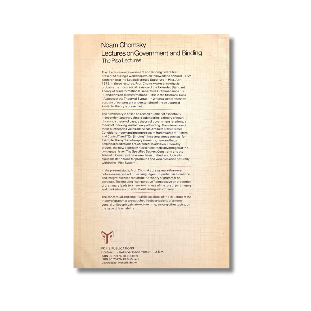 The "Lectures on government and binding" were first presented during a workshop which followed the annual GLOW conference at the Scuola Normale Superiore in Pisa., April 1979. In these lectures, Prof. Chomsky presents what is probably the most radical revision of the Extenden standard theory of transformational generative grammar  since his "Conditions on transformations". This is the firs book since "Aspects of the theory of syntax" in which a comprehensive account of our present understanding of the structure of syntactic theory is presented.