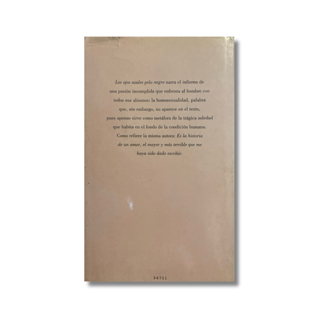 Los ojos azules pelo negro narra el infierno de una pasión incumplida que enfrenta al hombre con todos sus abismos: la homosexualidad, palabra que, sin embargo, no aparece en el tecto, pues apenas sirve como metáfora de la trágica soledad que habita en el fondo de la condición humana. Como refiere la misma autora: Es la historia de un amor, el mayor y más terrible que me haya sido dado escribir.