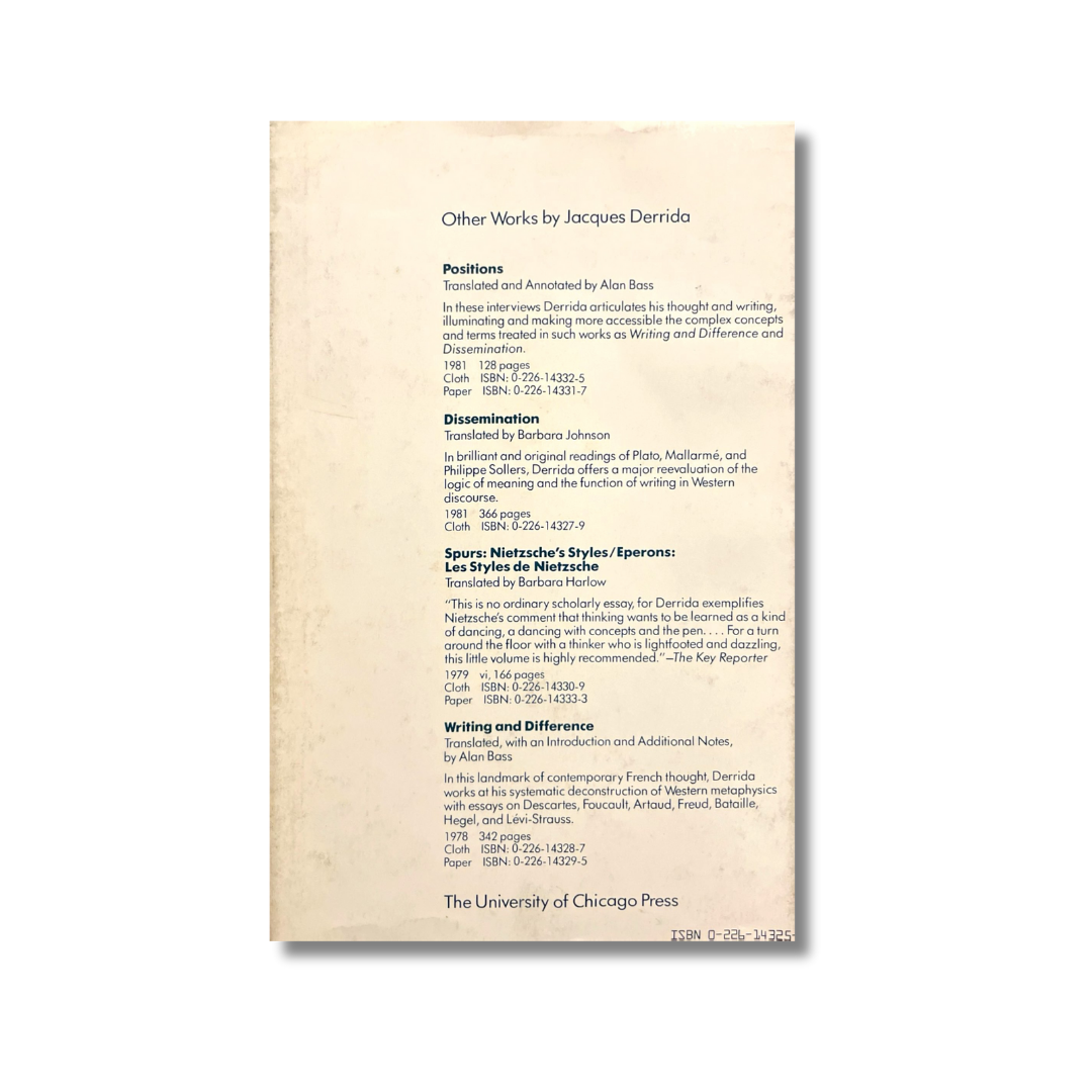 “In this densely imbricated volume Derrida pursues his devoted, relentless dismantling of the philosophical tradition, the tradition of Plato, Kant, Hegel, Nietzsche, Husserl, Heidegger—each dealt with in one or more of the essays. There are essays too on linguistics (Saussure, Benveniste, Austin) and on the nature of metaphor (“White Mythology”), the latter with important implications for literary theory. Derrida is fully in control of a dazzling stylistic register in this book—a source of true illumination for those prepared to follow his arduous path. Bass is a superb translator and annotator. His notes on the multilingual allusions and puns are a great service.”—Alexander Gelley, Library Journal