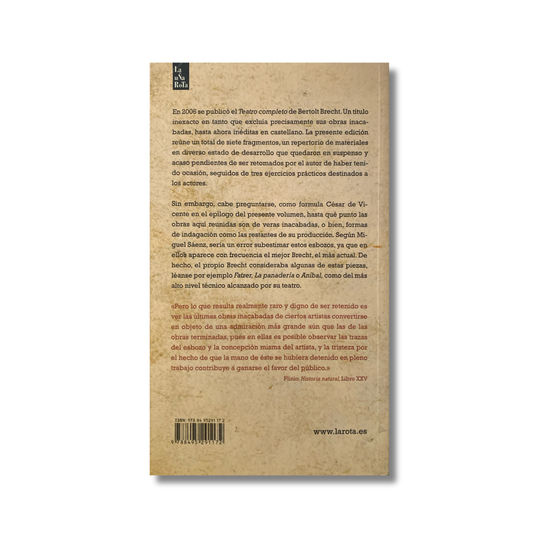 Con «Obra inacabada» La uÑa RoTa completa el teatro de Brecht en español publicado por Alianza y recogido en un solo volumen, en 2006, por la editorial Cátedra. La edición que aquí presentamos reúne un total de ocho piezas escénicas, un repertorio de materiales en diverso estado de desarrollo pendientes de ser retomados por el autor después de haberlas estrenado.