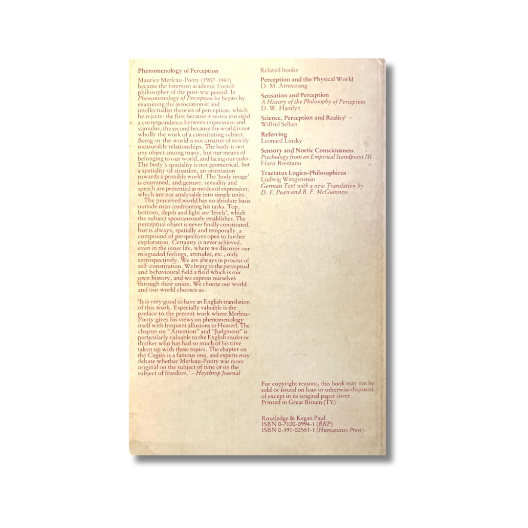 Phenomenology of Perception stands in the great phenomenological tradition of Husserl, Heidegger, and Sartre. Yet Merleau-Ponty’s contribution is decisive, as he brings this tradition and other philosophical predecessors, particularly Descartes and Kant, to confront a neglected dimension of our experience: the lived body and the phenomenal world. Charting a bold course between the reductionism of science on the one hand and intellectualism on the other, Merleau-Ponty argues that we should regard the body not as a mere biological or physical unit, but as the body which structures one’s situation and experience within the world.