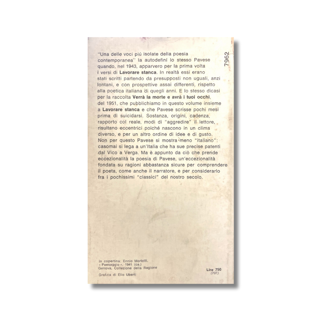 "Una delle voci piú isolate della poesia contemporanea" la utodefiní lo stesso PAvese quando, nel 1943, apparvero per la prima volta i versi di Lavorare stanca. In  realtà essi erano stati scritti partendo da presupposti non uguali, anzi, lintani, e con prospettive assai differenti, respetto alla poetica italiana di quegli anni. E lo stesso dicasi per la raccolta Verrá la morte e avrà i tuoi occhi, del 1951, che pubblichiamo in questo volume insieme a Lavorare stanca e che Pavese scrisse pochi mesi prima di suicidarsi. Sostanza, origini, cadenza, rapporto col reale, modi di "aggrediere" il lettore, risultano eccentrici poiché nascono in un clima diverso, e per un altro ordine di idee e di gusto. Non per questo Pavese si mostra meno "italiano": casomai si lega a un'Italia che ha sue precise patenti dal Vico a Verga. Ma è appunto da ciò che prende eccezionalità la poesia de Pavese, un'eccezionalità fondata su ragioni abbastanza sicure per comprendere il poeta, come anche il narratore, e per considerarlo fra i pochissimi "classici" del nostro tempo.