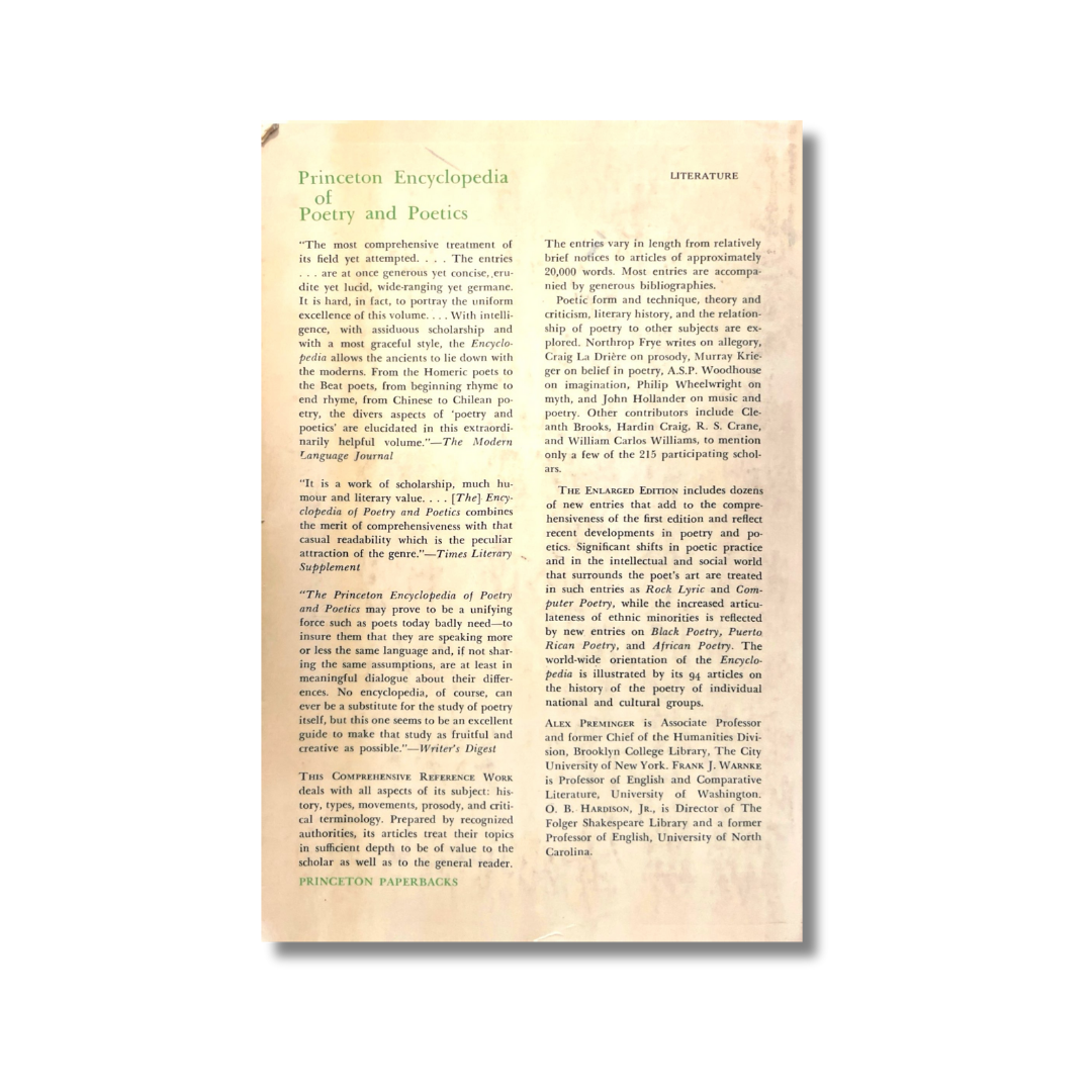 Princeton Encyclopedia of Poetry and Poetics is a comprehensive reference work dealing with all aspects of its subject: history, types, movements, prosody, and critical terminology. Prepared by recognized authorities, its articles treat their topics in sufficient depth and with enough lucidity to satisfy the scholar and the general reader alike.