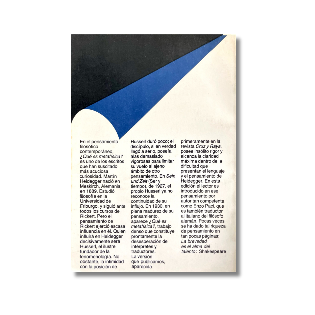 En 1930, en plena madurez de su pensamiento, aparece ¿Qué es la metafísica?, trabajo denso que constituye prontamente la desesperación de intérpretes y traductor. La versión que publicamos, aparecida primeramente en la revista Cruz y raya, posee insólito rigor y alcanza la claridad máxima dentro de la dificultad que presentan el lenguaje y el pensamiento de Heidegger.