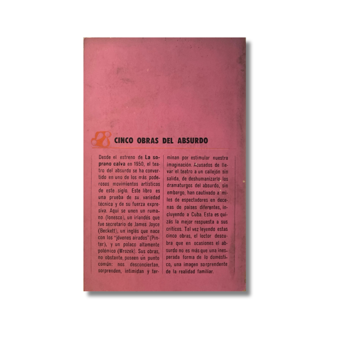 Desde el estreno de La soprano calva en 1950, el teatro del absurdo se ha convertido en uno de los más poderosos movimientos artísticos de este siglo. Este libro es una prueba de su variedad técnica y de su fuerza expresiva. Aquí se unen un rumano (Ionesco), un irlandés que fue secretario de James Joyce (Beckett), un inglés que nace con los "jóvenes airados" (Pinter) y un polaco altamente polémico (Mrozek). Sus obras, no obstante, poseen un punto común: nos desconciertan, sorprenden, intimidan y terminan por estimular nuestra imaginación.