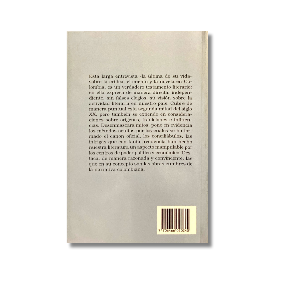—la última de su vida— sobre crítica, el cuento y la novela en Colombia, es un verdadero testamento literario: en ella expresa de manera directa, independiente, sin falsos elogios, su visión sobre la actividad literaria en nuestro país. Cubre de manera puntual esta segunda mitad del siglo XX, pero también se extiende en consideraciones sobre orígenes, tradiciones e influencias. Desenmascara mitos, pone en evidencia los métodos ocultos por los cuales se ha formado el canon oficial, los conciliábulos, las intrigas que con tanta frecuencia han hecho nuestra literatura un aspecto manipulable por los centros de poder político y económico. Destaca, de manera razonada y convinvente, las que en su concepto son las obras cumbres de la narrativa colombiana.