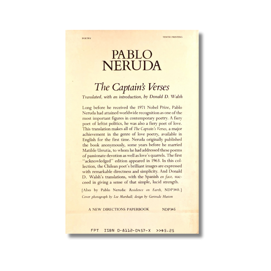 Long before he received the 1971 Nobel Prize, Pablo Neruda had attained worldwide recognition as one of the most important figures in contemporary poetry. A fiery poet of leftist politics, he was also a fiery poet of love. This translation makes all of The captain's verses, a majorachievement in the genre of love poetry, available in English for the first time.