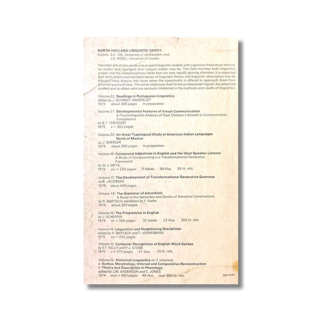 The main aim of this series is to present linguistics studies with a genuine theoretical interest, no matter how divergent theur subject matter may be. This field includes both linguistics proper and the interdisciplinary fields that are now rapidly gaining attention. It is expected that both recent and standard issues of linguistic thepry and linguistic description may be brought more sharply into focus when the opportunity is offered to approach them from different points of view.