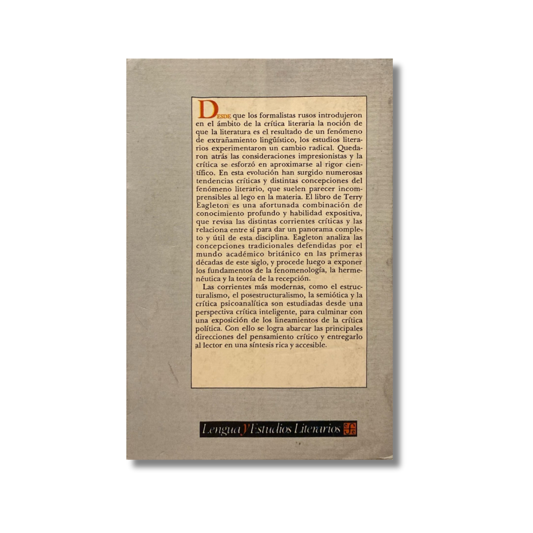 Desde que los formalista rusos introdujeron en el ámbito de la crítica literaria la noción de que la literatura es el resultado de un fenómeno de extrañamiento lingüístico, los estudios literarios experimentaron un cambio radical. Quedaron atrás las consideraciones impresionistas y la crítica se esforzó en aproximarse al rigor científico. En esta evolución han surgido numerosas tendencias críticas y distintas concepciones del fenómeno literario, que suelen parecer incomprensibles al lego en la materia. El libro de Terry Eagleton es una fortunada combinación de conocmiento profundo y habilidad expositiva, que revisa las distintas corrientes críticas y las relaciones entre sí para dar un panorama completo y útil de esta disciplina. Eagleton analiza las concepciones tradicionales defendidas por el mundo académico británico en las primeras décadas de este siglo, y procede luego a exponer los fundamentos de la fenomenología, la hermenéutica y la teoría de la recepción.