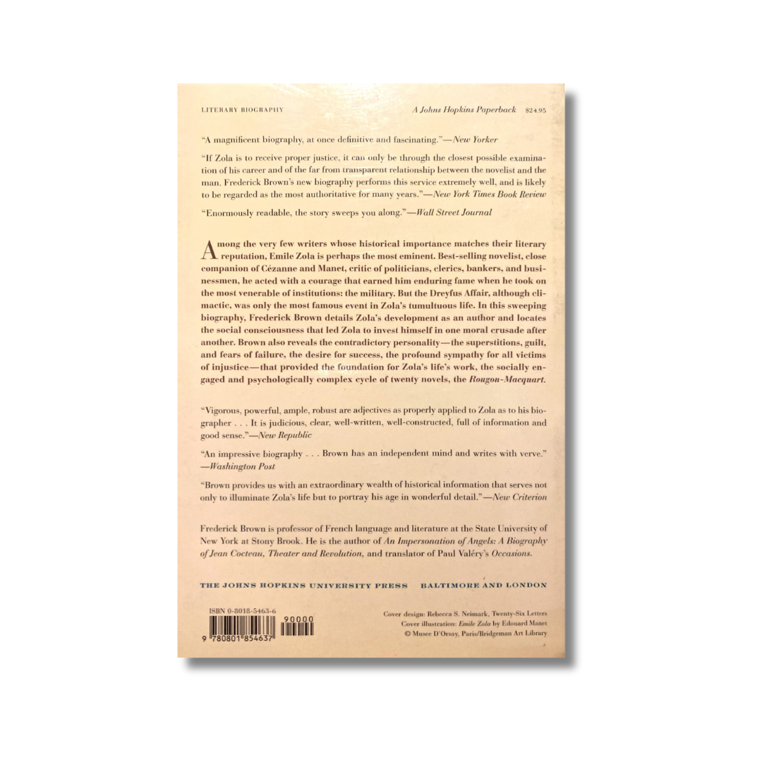 mong the short list of authors whose lives were as exciting as their books, Emile Zola is one of the most eminent. Bestselling author of a series of novels, close companion of Cézanne and Manet, critic of politicians, clergy, bankers, and businessmen, he acted with a courage that earned him enduring fame when he took on the most venerable of all institutions: the military. But, climactic as it was, the Dreyfus Affair was only the most famous of events in Zola's tumultuous life. In this detailed biography, Frederick Brown discloses Zola's development as an author, and the moral consciousness that led him to invest himself in one social and political problem after another. Brown also shows Zola's human side--his failings, his superstitions, his private joys and dilemmas. At a time when a career could be made by a well-timed review or be broken by a rebuttal, Zola carved out his place in the literary pantheon through a series of struggles against ever more powerful enemies.